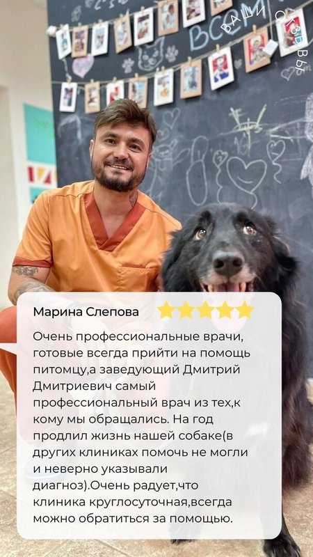 Осталось замечательное впечатление, прекрасное, все как всегда, на высшем уровне. Дмитрию Дмитриевичу и всем сотрудникам низкий поклон. У доктора лечимся всегда, у нас 3 питомца, он нам оказывает очень качественные услуги, с такой душой, как к своему питомцу, прекрасное отношение, очень грамотный врач. Обратились, так как у животного сильно лезла шерсть, провели обследование, скорректировали рацион питания, назначили соответствующее лечение, лечимся, все хорошо.